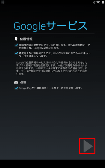 Googleサービスに関する内容が表示されたら、内容を確認し、画面右下の「」をタップします。