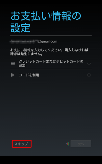 「お支払い情報の設定」が表示されたら、画面左下の「スキップ」をタップします。