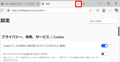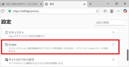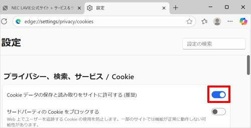 ※ Microsoft Edgeの初期設定では、Cookieは有効になっています。
