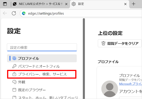 画面左側から「プライバシー、検索、サービス」をクリックします。