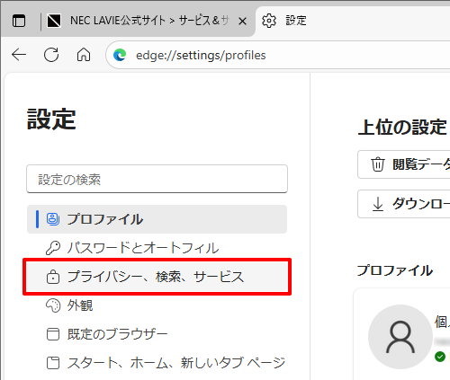 画面左側から「プライバシー、検索、サービス」をクリックします。