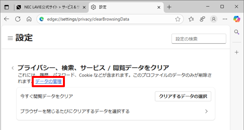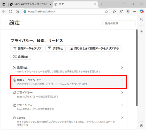 Microsoft Edgeの設定から保存済みのWebサイトデータを削除することで、検索履歴が削除されます。