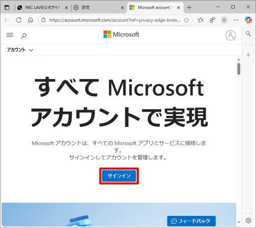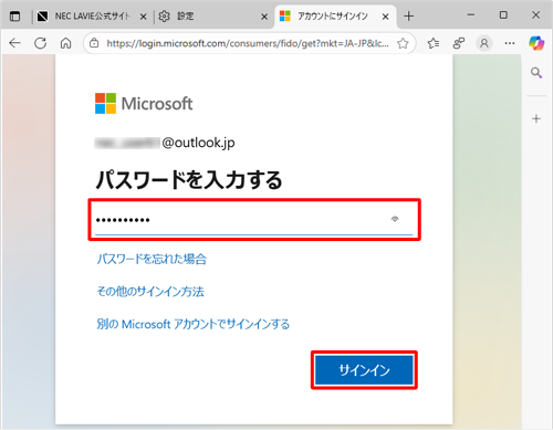 「パスワードの入力」が表示されたら、Microsoftアカウントのパスワードを入力し、「サインイン」をクリックします。