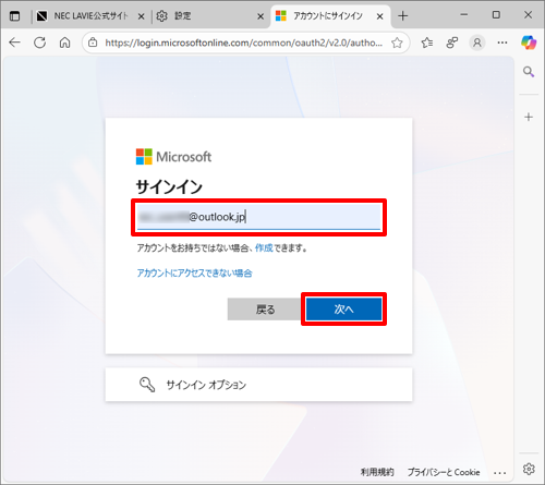 「サインイン」が表示されたら、パソコンにサインインしているMicrosoftアカウントのメールアドレスを入力し、「次へ」をクリックします。