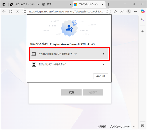 「Windows Helloまたは外部セキュリティキー」をクリックします。