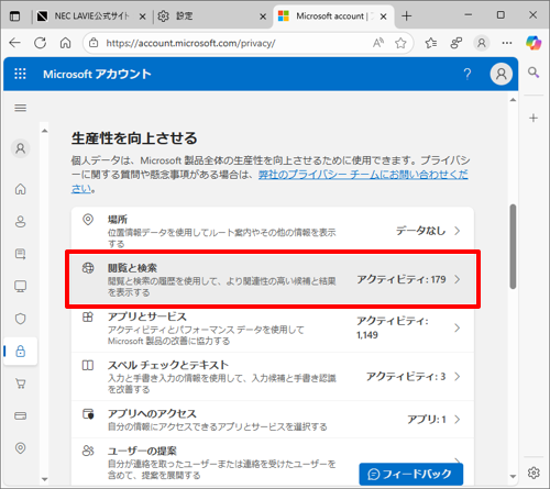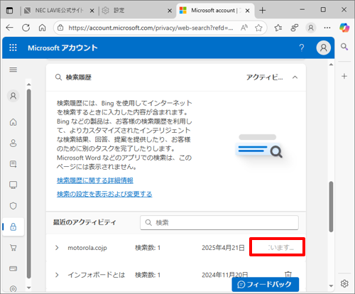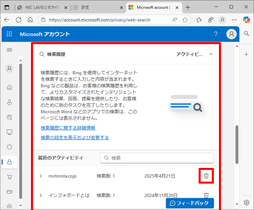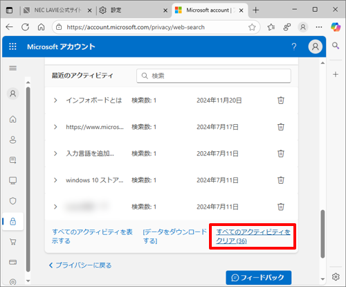 過去に表示した検索データなどの履歴を残したくない場合は、Microsoftアカウントにサインインし、アクティビティの履歴から検索履歴を削除することができます。