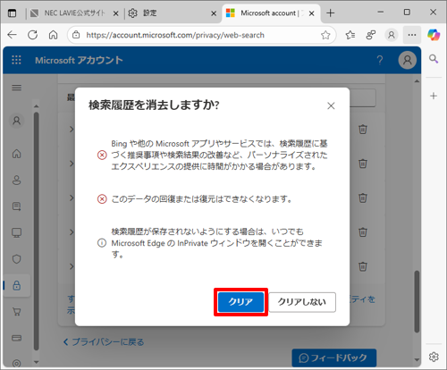 「検索履歴を消去しますか?」が表示されたら、「クリア」をクリックします。