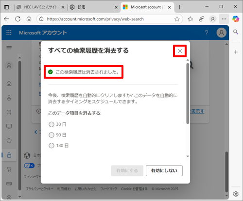 「この検索履歴は消去されました。」と表示されていることを確認して、画面右上の「×」をクリックします。