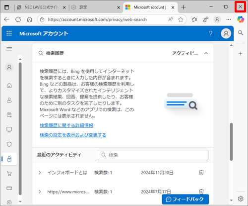 選択した検索履歴が削除されたことを確認して、画面右上の「×」をクリックします。