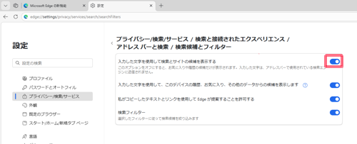 「入力した文字を使用して、検索とサイトの候補を表示する」のスイッチをクリックして「オン」にします。