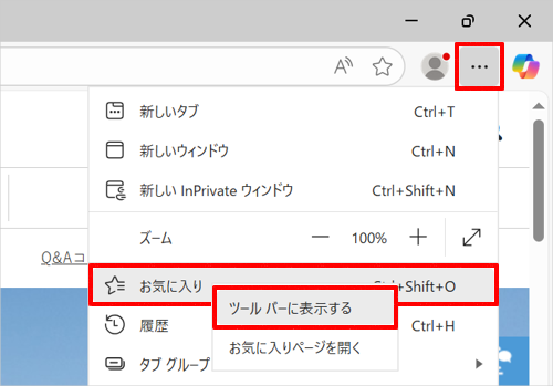 」(設定など)をクリックし「お気に入り」を右クリックして、表示された一覧から「ツールバーに表示する」をクリックします。