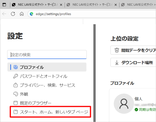 画面左側から「スタート、ホーム、新しいタブページ]をクリックします。