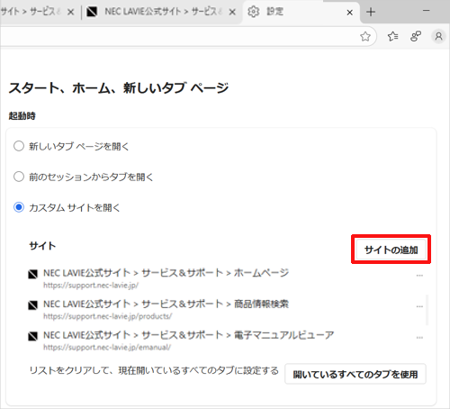 起動時に表示する特定のページをすでに設定していて、Webページを追加したい場合は、以下の操作手順を行ってください。