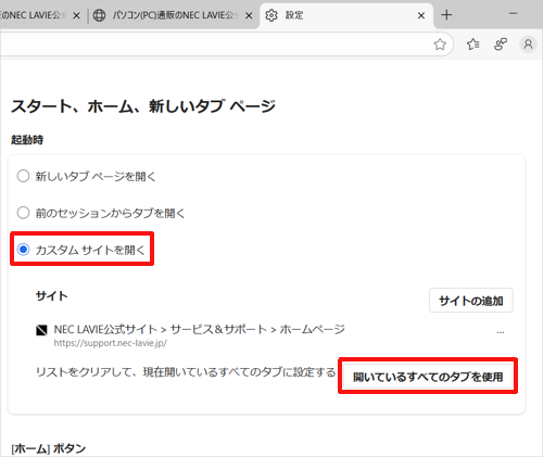 「カスタムサイト開く」をクリックし、「リストをクリアして、現在開いているすべてのタブに設定する」欄から「開いているすべてのタブを使用」をクリックします。