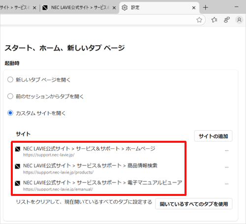 複数のWebページを登録した場合、Microsoft Edgeを起動すると、設定したWebページ分のタブが表示されます。