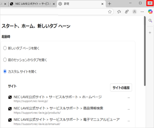Windows 11のMicrosoft Edgeで起動直後に表示されるページを変更する方法