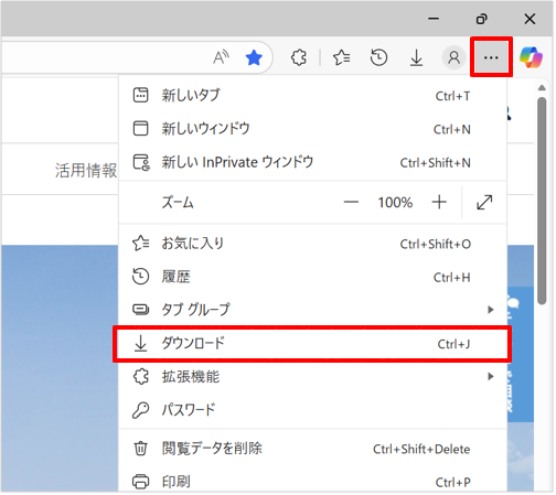 Microsoft Edgeを起動し、「」(設定など)をクリックして、表示された一覧から「ダウンロード」をクリックします。