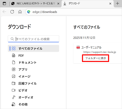 Windows 11のMicrosoft EdgeでWebページからダウンロードしたファイルの保存先を表示する方法