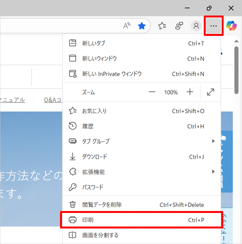 画面右上の「」(設定など)をクリックし、表示された一覧から「印刷」をクリックします。