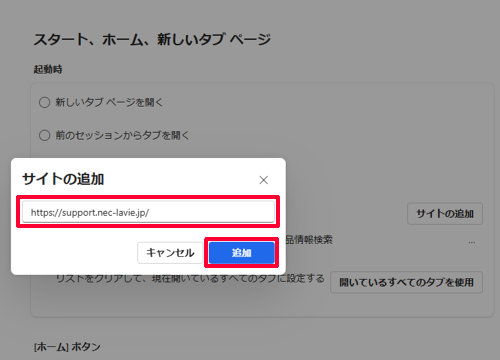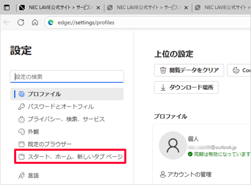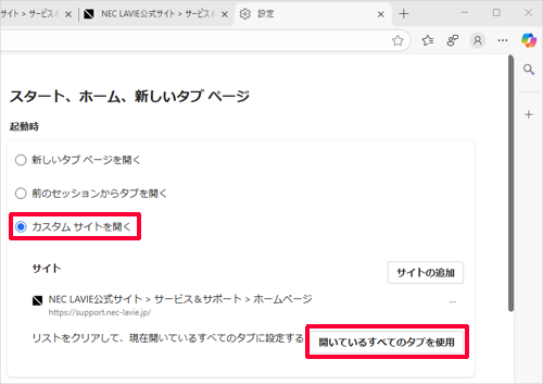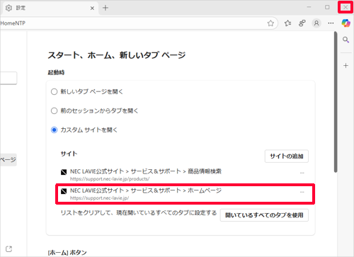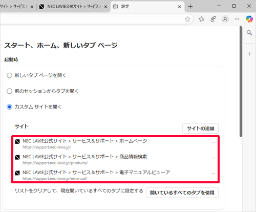 Q&A検索 製品 LAVIE Windows 10のMicrosoft Edgeで起動時に複数のWebページを表示する方法