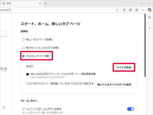 3. 「起動時」欄の「カスタムサイトを開く」をクリックし、「サイト」欄から「サイトの追加」をクリックします。