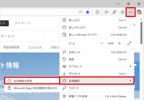 Microsoft Edgeを起動し画面右上の「」(設定など)をクリックして、表示された一覧から「拡張機能」にカーソルを合わせて「拡張機能の管理」を クリックします。