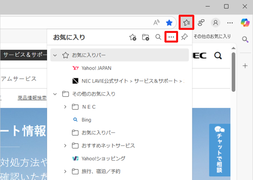 Microsoft Edgeを起動し、「」(お気に入り)をクリックして、「