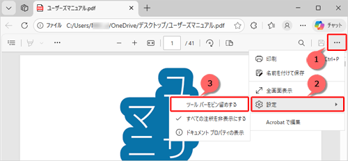 Windows 10のMicrosoft EdgeでPDFファイル閲覧時に表示されるツールバーを固定表示するには、以下の操作手順を行ってください。