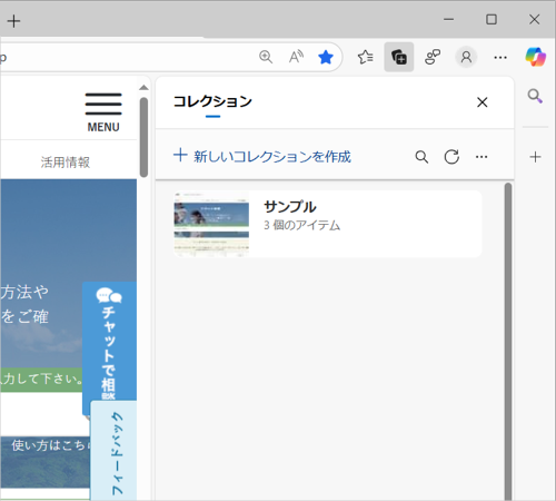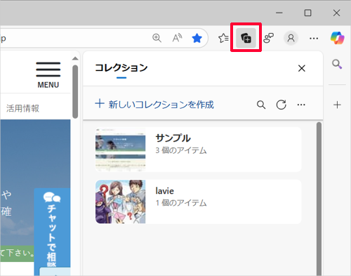 Microsoft Edgeを起動し、「」(コレクション)をクリックして、保存されているコレクションの一覧を表示します。