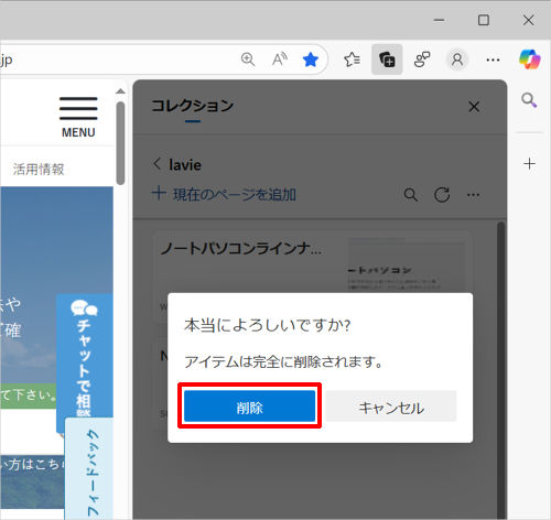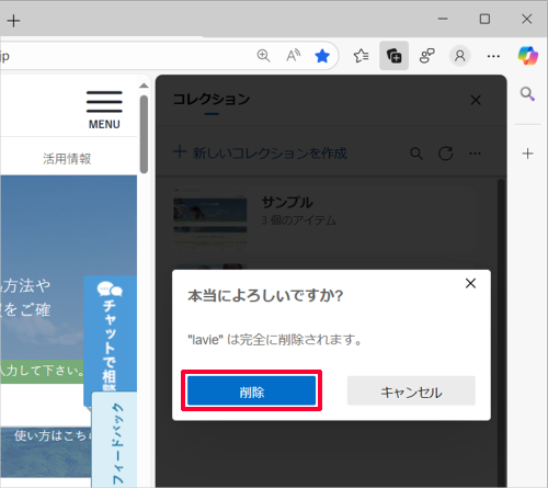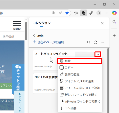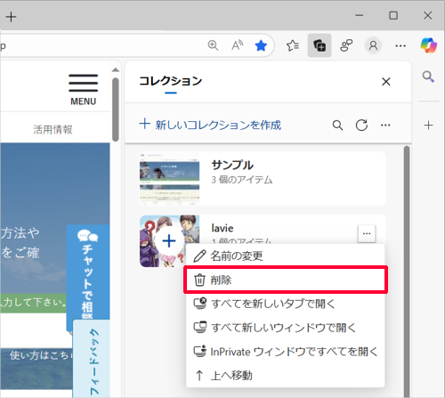 Windows 10のMicrosoft Edgeでコレクションを削除するには、以下の操作手順を行ってください。