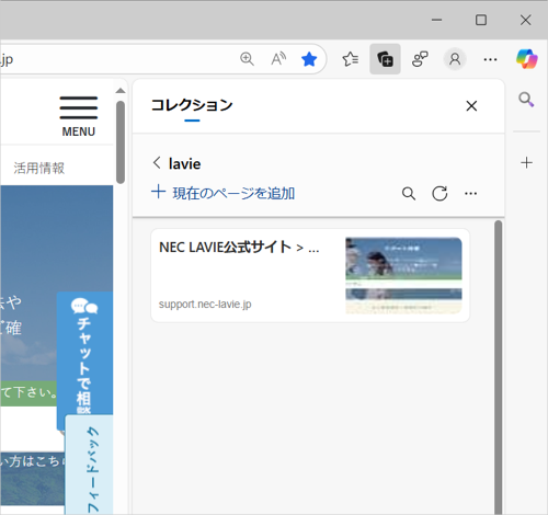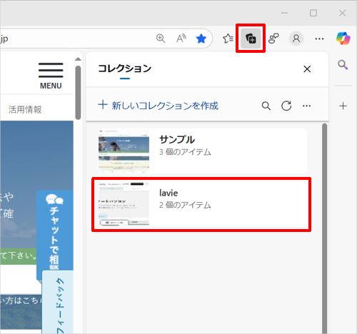 Microsoft Edgeを起動し、「」(コレクション)をクリックして、保存されているコレクションをクリックします。