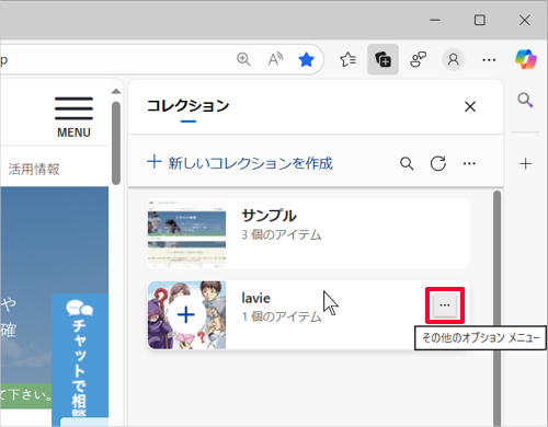 削除したいコレクションにマウスを合わせて、「」(その他のオプションメニュー)をクリックします。