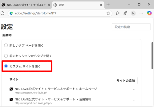 「起動時」欄たら、「カスタムサイトを開く」をクリックします。