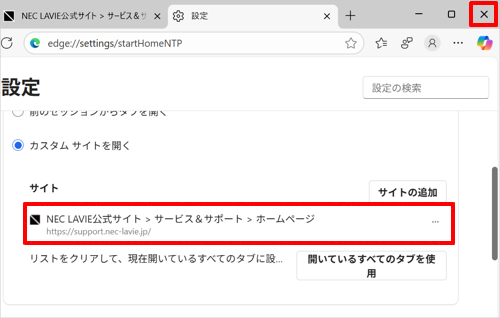 「サイト」欄のWebページを1つにしたら、「×」(閉じる)をクリックしてMicrosoft Edgeを終了します。