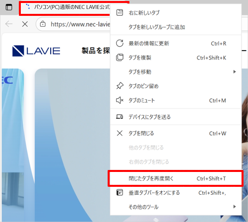 任意のタブを右クリックし、表示された一覧から「閉じたタブを再度開く」をクリックします。