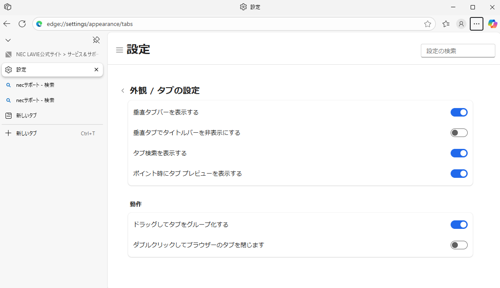 Microsoft Edgeでタブバーが縦に表示されたことを確認してください。