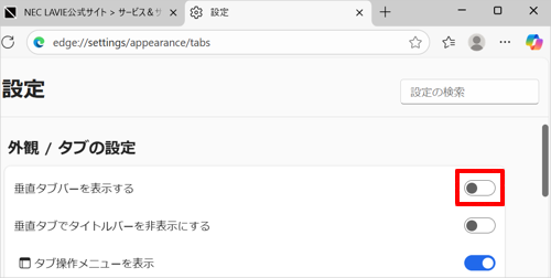 「外観 / タブの設定」欄から、「垂直タブバーを表示する」のスイッチをクリックし、「オフ」(グレー)にします。