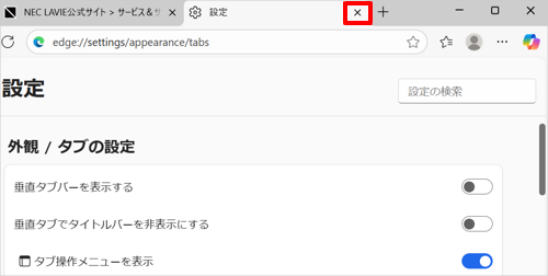 「設定」タブの「×」(タブを閉じる)をクリックして設定画面を閉じます。