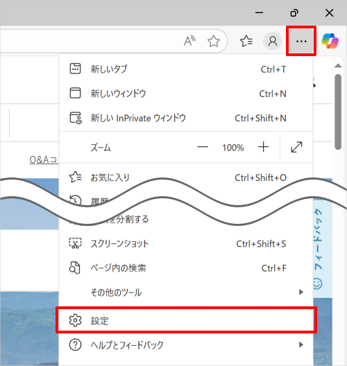 Microsoft Edgeを起動し、「」(設定など)をクリックして、表示された一覧から「設定」をクリックします。