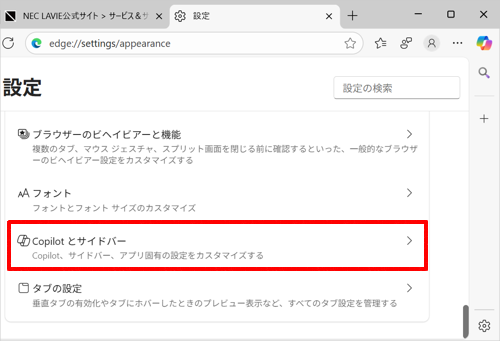 表示された画面を下にスクロールして、「Copilotとサイドバー」をクリックします。