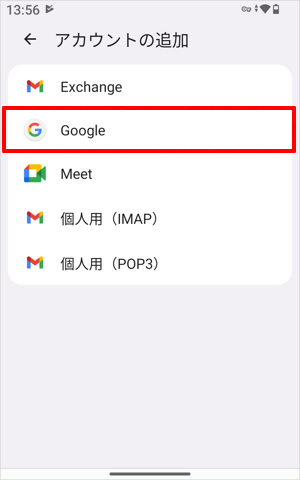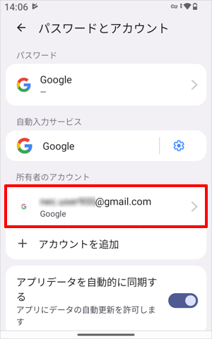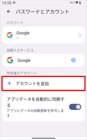「パスワードとアカウント」画面に戻ったら、登録したGoogleアカウントが表示されていることを確認します。