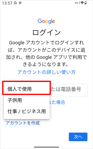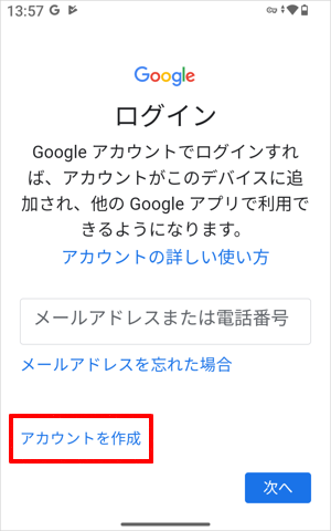 Googleの「ログイン」画面が表示されたら、「アカウントを作成」をタップします。