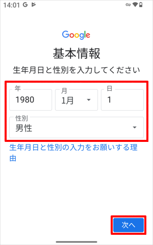 生年月日と性別をそれぞれのボックスに入力して、「次へ」をタップします。