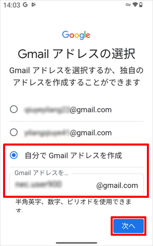 ここでは例として、「自分でGmailアドレスを作成」を選択し、ユーザー名ボックスに設定するGmailアドレスを入力します。