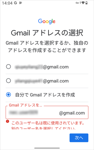入力したGmailアドレスがすでに第三者に取得されている場合、「このユーザー名は既に使用されています。…」と表示されるので、別のGmailアドレスを入力します。