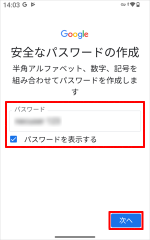 任意のパスワードを「パスワード」ボックスに入力し、「次へ」をタップします。