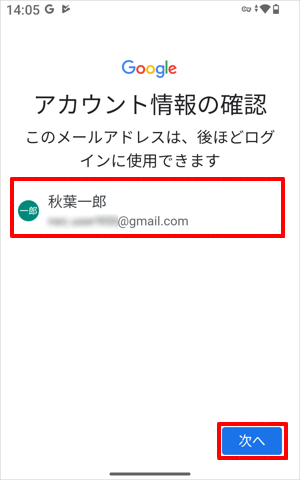 設定したアカウント情報に間違いがないことを確認し、「次へ」をタップします。