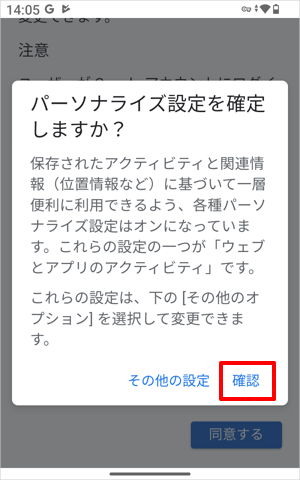 「パーソナライズ設定を確定しますか?」が表示されたら、「確認」をタップします。