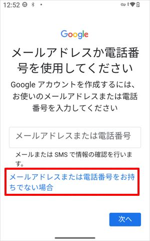 ここでは例として、「メールアドレスまたは電話番号をお持ちでない場合」をタップします。