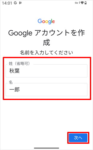 「姓」と「名」をそれぞれのボックスに入力して、「次へ」をタップします。
